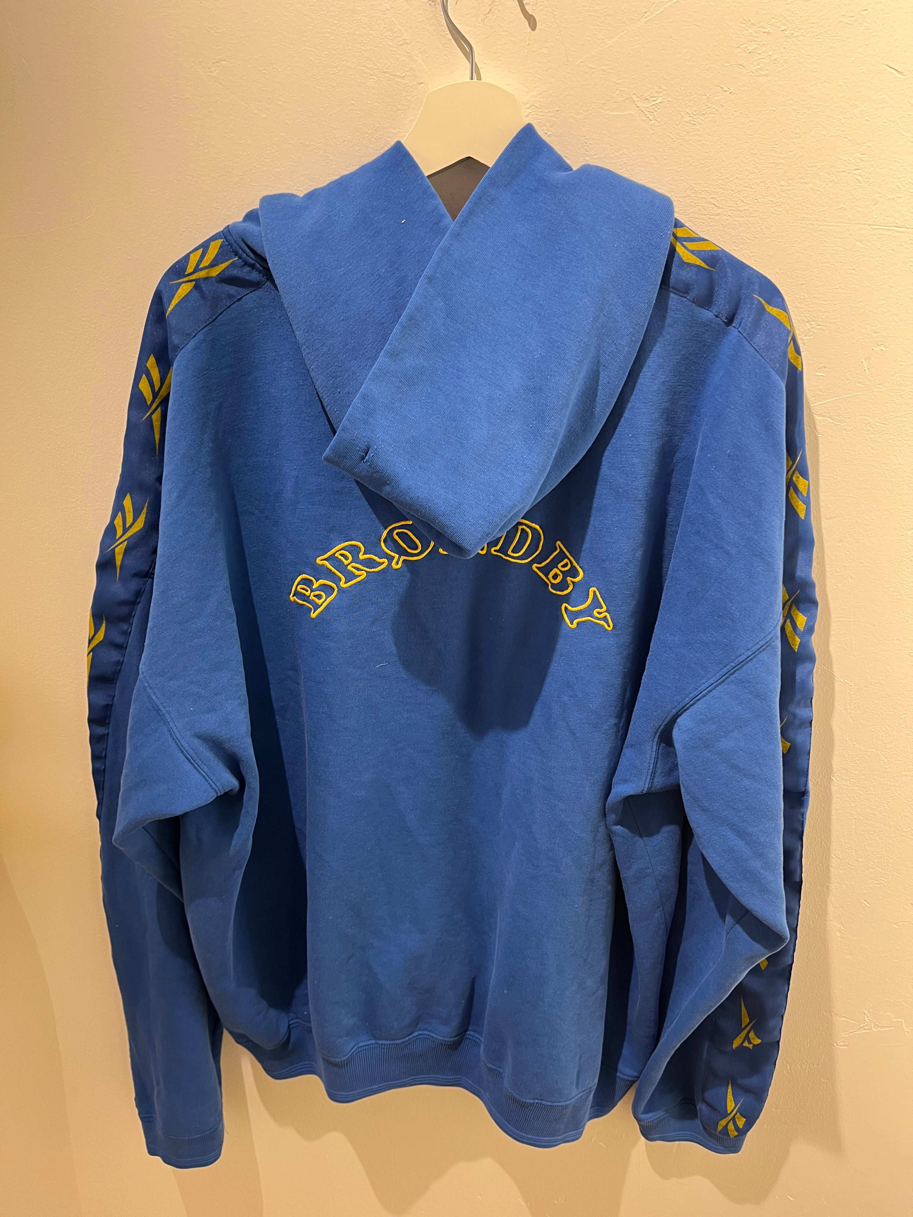 Brøndby IF Hættetrøje XL bagfra med 'BRØNDBY' tekst i gult og Reebok detaljer på ærmerne.