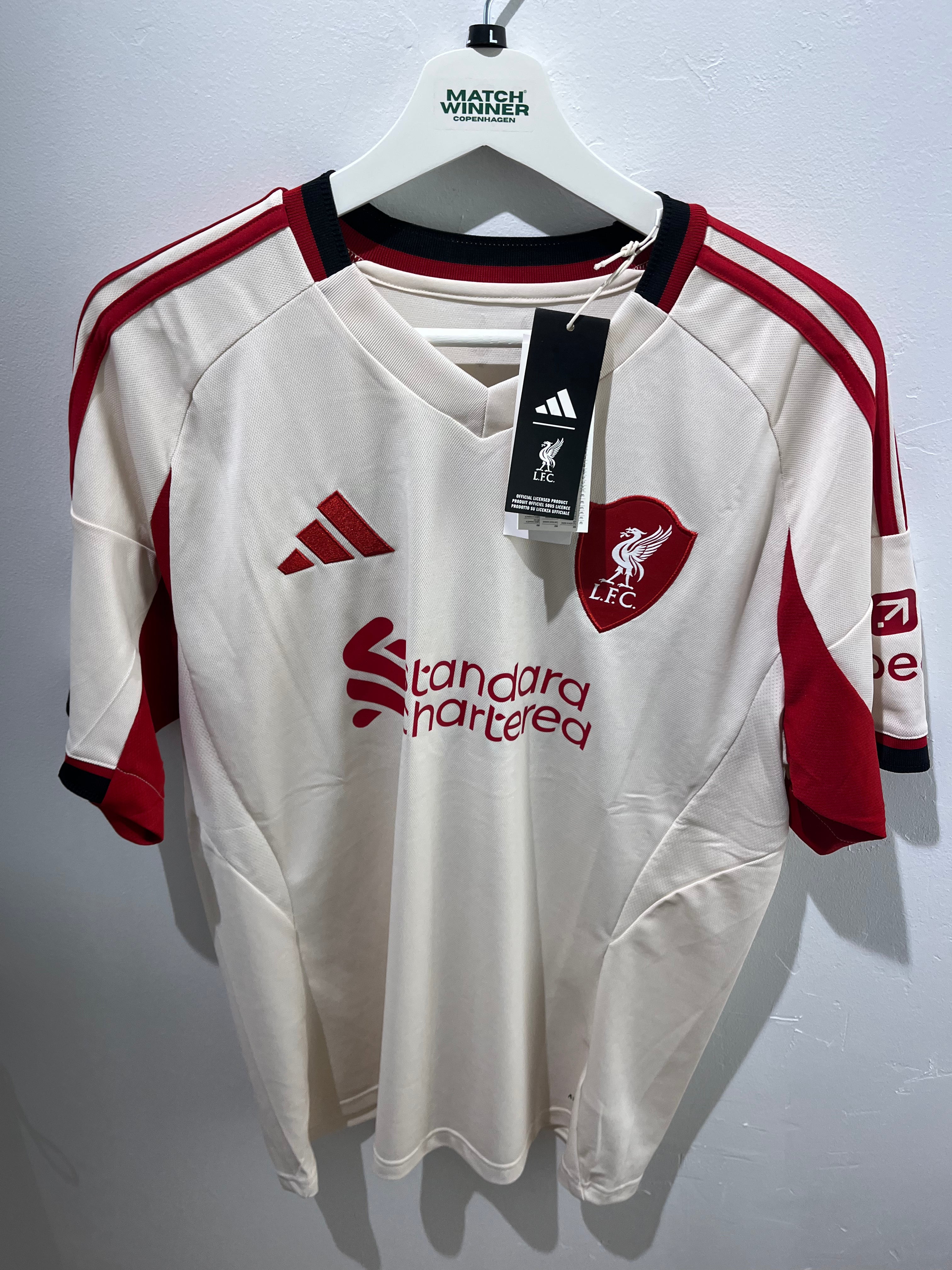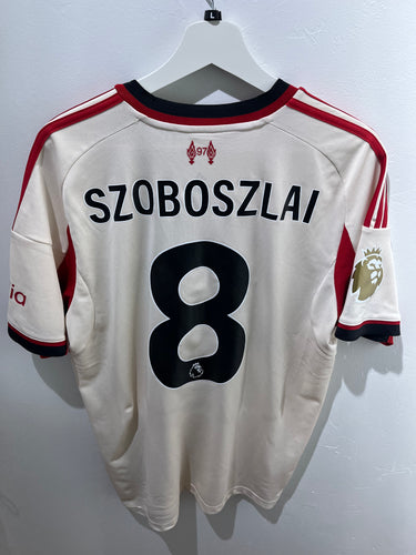 Liverpool Udebanetrøje fra 2025/26 Sæsonen med Dominik Szoboszlai #8 på Ryggen. Trøjen Har Guld Premier League Logo på Højre Ærme da De Vandt Mesterskabet i 2024/25 Sæsonen. I Størrelsen Large